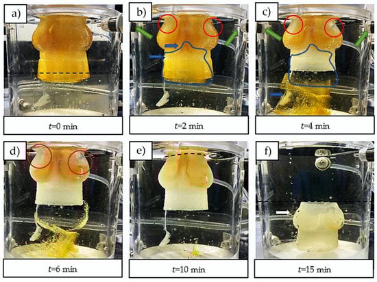 The filled molds were then transferred into a custom-made dissolution module that produces a constant influx of CaCl2 solution to complete the external gelation and dissolve the sugar (Figure 1e,f). The constant flux of the dissolution module improved the dissolution rate of the sugar glass mold compared to dissolution in a static aqueous solution by minimizing the sugar concentration inside the dissolution module. Additionally, it allowed the use of a less-concentrated CaCl2 solution by ensuring a fresh access to Ca2+ ions. The three inlet jets, located near the mid-sinus region (Figure 3b,c), provided a good perfusion of the Ca2+ ions into the scaffold. The dissolved sugar was aspirated through the three outlets located at the bottom of the dissolving module. At min (Figure 3a), the upper section was primarily filled with fresh CaCl2 solution, and the dissolved sugar went to the bottom of the module (yellowish lower section), which helped to accelerate the dissolution. At min (Figure 3b), the three inlet jets located at the top helped to break through the mold, which contributed to ameliorate perfusion of the CaCl2 solution inside the mold, and to accelerate the dissolution of the inner structure. At min (Figure 3d), the external surfaces of the mold were completely dissolved and the perfusion of the CaCl2 solution through the scaffold was easily observable. At min (Figure 3e), the scaffold was manually cut using a scalpel, which facilitated the dissolution of the remaining sugar inner structures of the mold. At min (Figure 3f), the dissolution was completed, and the aortic valve scaffold fell to the bottom at one point between and 15 min. A uniform yellowish color throughout the complete dissolution module was observed, corresponding to an estimated concentration of sugar of 2% w/v (approximately 30 g for the sugar glass mold divided by 1500 mL for the total volume of CaCl2 solution in the system). Figure 4 shows one of the resulting aortic valve scaffolds. The total manufacturing time of one aortic valve hydrogel scaffold (dissolution and internal/external gelation, excluding the printing time of the aortic valve mold) was 25 min. In future work, during which cells could be added to the alginate hydrogel, adjusting the inlet/outlet flow rate of the dissolving module to minimize the CaCl2 concentration should help to prevent cell death [,]. Adjusting the inlet/outlet flow could represent an interesting way to maximize cell access to nutrients from the culture media and the serum during the dissolution process with better perfusion through the scaffolds. Finally, to minimize the sugar concentration effects on cells in future research, the three outlet flows should be evacuated.