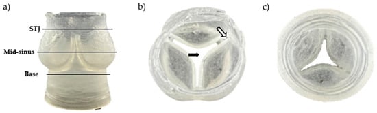 Resulting aortic valve scaffold made of sodium-alginate hydrogel. (a) Side view with three regions of interest (STJ: sino tubular junction). (b) Top view. The black arrow shows the opened central area, and the white arrow shows the leaflet thickness and the spacing at the commissure. (c) Bottom view.