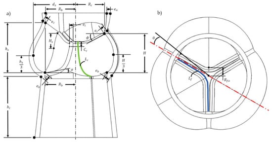 Geometry and parameters of the aortic valve scaffold model. (a) Inner section. (b) Top view.