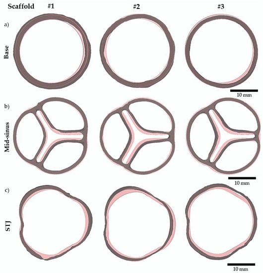 Three aortic valve scaffolds were compared to the original computer-designed model. Images generated after 3D reconstruction of micro-CT scans of n = 3 scaffolds are shown in grey. The original computer-designed model to which a uniform contraction of 13% was imposed is shown in pink. (a) Base slices. (b) Mid-sinus slices. (c) STJ (sino tubular junction) slices.