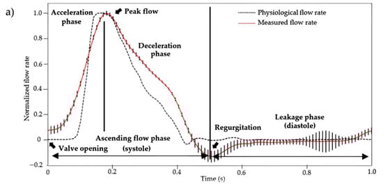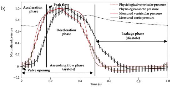 (a) Average measured flow rate and (b) pressures (aortic and ventricular) normalized profiles (n = 12 cardiac cycles) at 60 BPM. These were obtained using a custom-made cardiac bioreactor on three aortic valves scaffolds (measured data curves) and compared to the physiological profiles (physiological value curves) []. The vertical bars represent the standard deviation at each acquisition time (100 Hz) of the average profiles of the three aortic valve scaffolds.