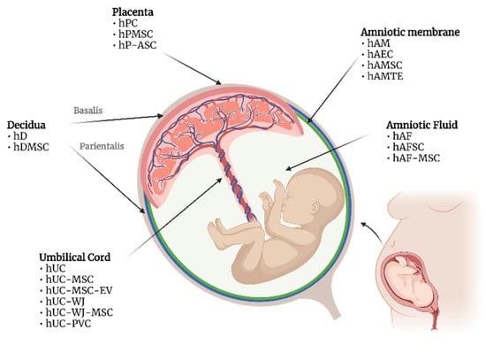 Considering the high variability reported in the literature on terminologies and abbreviations adopted by different authors, we harmonized the terms according to the Consensus for Tissue and Cell Nomenclature recently published by the COST SPRINT Action (CA17116) consortium (Figure 1) []. Briefly, the abbreviations adopted include human placenta-derived mesenchymal stromal/stem cells (hPMSC), human placenta-derived adherent stromal cells (hP-ASC), human amniotic fluid stromal/stem cells (hAFSC), human amniotic fluid MSC (hAF-MSC), human amniotic membrane epithelial cells (hAEC), human amniotic membrane MSC (hAMSC), human amniotic membrane tissue extract (hAMTE), human decidua MSC (hDMSC), human umbilical cord MSC (hUC-MSC), human umbilical cord Wharton’s jelly MSC (hUC-WJ-MSC), human umbilical cord perivascular cells (hUC-PVC), and hUC-MSC-derived extracellular vesicles (hUC-MSC-EV).