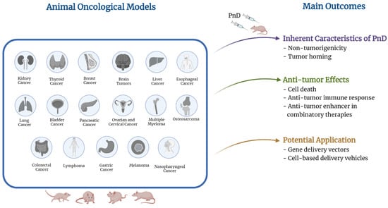 Summary of the animal oncological models for which the anticancer effects of PnD have been assessed and the main outcomes observed.