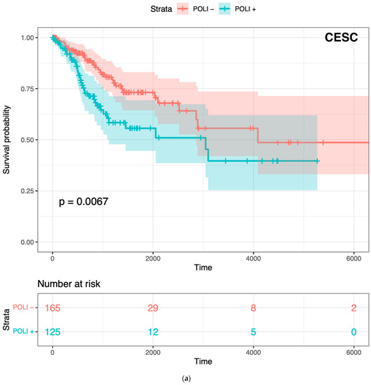 Figure 1. Prognostic value of POLI in CESC, PADD, and combined cancers: (a) Survival analysis of 291 patients in CESC vs. POLI expression; (b) Survival analysis of 176 patients in PAAD vs. POLI expression; (c) Survival analysis of 5213 patients in 11 cancer types.
