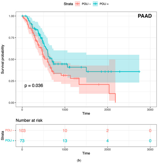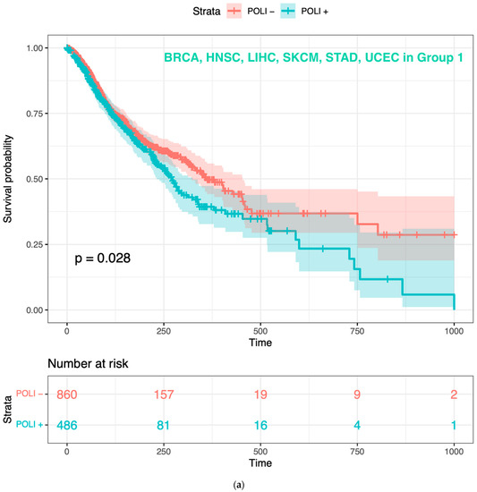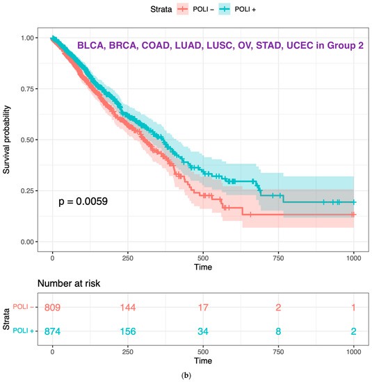 Figure 2. Reoccurrence of the prognostic value of POLI expression in regrouped cancer types: (a) K-M plot of POLI expression for patients in BRCA, HNSC, LIHC, SKCM, STAD, and UCEC from Group 1; (b) K–M plot of POLI expression for patients in BLCA, BRCA, COADREAD, LUAD, LUSC, OV, STAD, and UCEC from Group 2.