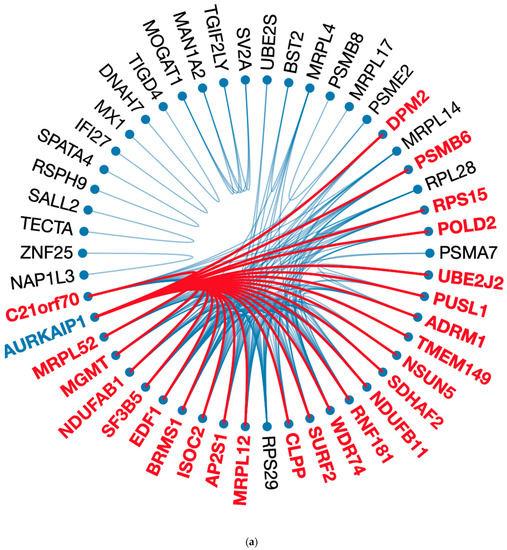 In CESC, AURKAIP1 was associated with 25 genes, forming an isolated cluster consisting of 36 genes. Other independent clusters contained two to four highly associated genes. In PAAD, CPLX2 was associated with 12 genes in one of the large clusters containing 30 genes in total. MRPL4, PSMB6, RSPH9, SURF2, CLPP, DNAH7, MRPL12, ISOC2, C21orf70, BRMS1, EDF1, SF3B5, NAP1L3, NSUN5, DPM2, SALL2, SPATA4, RPS15, MGMT, NDUFB11, SV2A, and RPL28 existed in CESC and PAAD regarding the top 50 highly associated genes. AURKAIP1 and CLPX2 existed in a much sparser gene network with a reduction to 25 vertices in CESC and PAAD (Figure S5).