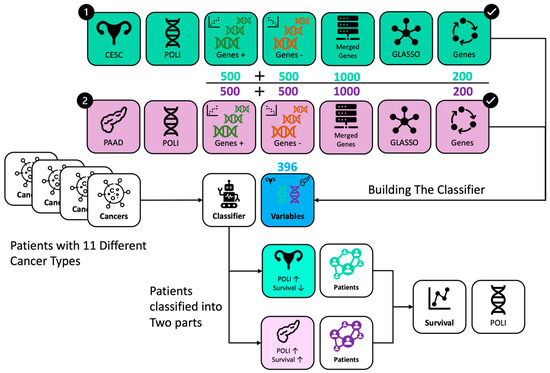 Genes used to build the classifier were selected from CESC and PAAD separately. A total of 1000 genes, which consisted of the top 500 positively associated with POLI and the top 500 negatively associated were combined for CESC and PAAD, respectively. GLASSO was applied to introduce the sparsity to the inverse covariance matrix for gene–gene correlation and select the highly associated 200 genes from 1000 merged genes [48]. A total of 200 genes from CESC and another 200 genes from PAAD were joined as the final gene list as the classifier features.