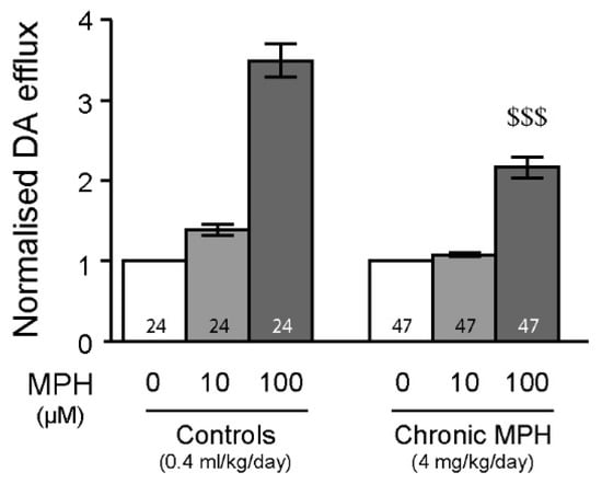 2.4. Tolerance to MPH and Dopamine in Chronically Treated Animals