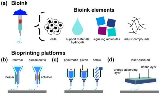 Overview of bioink elements and common bioprinting platforms. (a) Bioink composition. The main elements of bioinks are cells, support materials—mostly hydrogels—signaling molecules, and matrix compounds. (b) Jet-based drop-on-demand bioprinting enables droplet-based bioink deposition. Droplet formation and deposition can be induced, for example, thermally induced air pressure or piezoelectric pressure. (c) Microextrusion bioprinting is based on bioink filament extrusion to fabricate constructs in a layer-by-layer fashion. Bioink extrusion is facilitated by pneumatic or mechanical forces (piston or screw system). (d) Laser-assisted bioprinting enables bioink deposition on a receiving substrate layer by pulsed-laser-induced forward transfer (arrow) via an energy-absorbing layer.