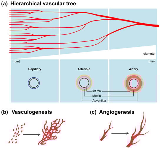 In nature, the macrovasculature and the microvasculature differ in both structural composition and function [,] (Figure 2a). For the future bioprinting of parenchymal tissue with vascular trees, both systems need to be integrated into the manufacturing process. Macrovascular structures are required for anastomosis with the host circulation, whereas a high-density microvascular network is necessary to enable the transfer of oxygen and nutrients to the tissue. Artificial macrovascular arteries and veins have very limited transport and pressure-regulating functions []. The walls of arterial and venous vessels comprise three layers: (i) the inner tunica intima, with an endothelial lining; (ii) the tunica media, with smooth muscle cells; and (iii) the outer tunica adventitia, containing loose connective tissue and fibroblasts [,] (Figure 2a). Besides the geometric considerations, bioartificial vascular structures need to maintain resistance to thrombogenicity, immunogenicity, inflammation, and foreign-body response []. The response of a tissue to bioprinted grafts is modulated by its chemical, physical, and mechanical properties. To date, bioprinted macrovascular structures lack mechanical integrity due to insufficient crosslinking of the mature extracellular matrix (ECM) [,]. Bioartificial macrovascular medical products such as the poly(glycolic acid)-based, decellularized vessel Humacyte® are currently in phase II clinical trials for arteriovenous fistula creation in selected patients []. This system has been demonstrated to be noninferior to synthetic vascular grafts []. However, although the engineered vessel has a diameter of 6 mm, primary patency rates of 63% at 6 months and 28% at 12 months indicate the need for improvements []. Cell-containing bioprinted products are yet to be developed []. On the other hand, microvascular capillaries enable gas exchange and protein and substrate transport to perivascular tissue [,]. The diameters of small vessels such as arterioles, venules, and especially capillaries are in the small submillimeter range (Figure 2a). While the biofabrication of macrovessels has already been successful in vitro, the engineering of the microvasculature remains challenging. The direct or indirect printing of vascular structures cannot be completely scaled down to reproduce a capillary bed and is mostly limited to the manufacture of structures larger than 100 µm [,,,]. Thus, biomaterials, or rather bioinks themselves, may need to provide cues that promote vessel formation. Such self-assembly of a microvascular network can occur either by vasculogenesis (Figure 2b) or by angiogenesis (Figure 2c). The term vasculogenesis describes the completely new formation of a vascular structure and primitive vessel network, typically driven by endothelial progenitor cells (EPCs) in embryonic development [,] (Figure 2b). However, vasculogenesis is not limited to prenatal development []. Angiogenesis refers to capillary network formation starting from a pre-existing vessel, e.g., by sprouting [,] (Figure 2c). Both mechanisms need to be considered in the bioprinting of parenchymal tissue.