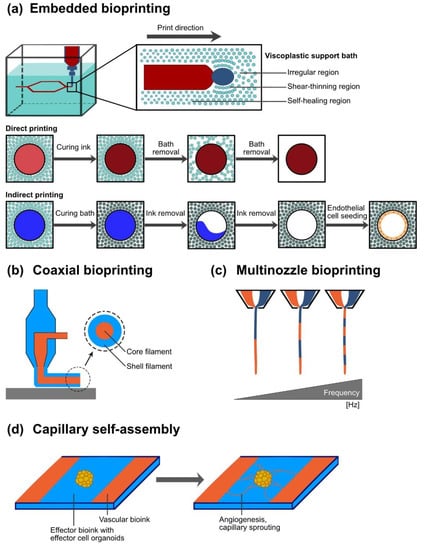 Bioprinting strategies to fabricate vascularization. (a) Embedded bioprinting into a (functional) viscoplastic support bath. Viscoplastic microsphere fluids present self-healing properties with fluid-like regions and shear-thinning effects directly along the moving microextrusion nozzle. Direct printing and subsequent in situ crosslinking of vascular bioink enables fabrication of free-form structures with high shape fidelity. Crosslinking can be initiated by the support bath, e.g., chemically. The microextrusion and subsequent dissolution of sacrificial bioinks after previous curing of the functional support bath can create hollow channel networks. Such networks can be perfused with endothelial cell solution for cell adherence and formation of an endothelial lining. (b) Coaxial microextrusion bioprinting using concentric nozzles enables simultaneous printing with different bioinks with a core–shell or layered cross-section. (c) Multinozzle bioprinting technology with fast high-frequency switching can fabricate continuous filaments from multiple materials. (d) Self-assembly of capillaries from bioprinted vessel-like structures. The cultivation of bioprinted tissue constructs can provide an environment that further enhances vascularization by self-assembly. Therefore, relevant angiogenic signals might need to be integrated in bioinks before printing.