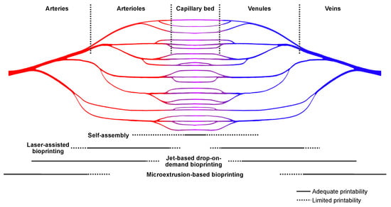 Bioprinting technologies categorized regarding their applicability for fabrication of macro- or microvascularization. Limited printability can be due to lack of resolution, low printing precision, and/or a long duration of the printing procedure. Small-scale capillaries cannot yet be fabricated by 3D-bioprinting technologies and are subject to self-assembly strategies.