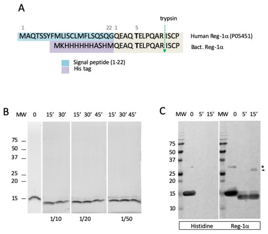 Bacterial His-tagged Reg-1α (Bact. Reg-1α) was purchased from Biovendor, and the eukaryotic form (Euk. Reg-1α) with no tag was from Bio-Techne (R&D systems, Noyal Chatillon sur Seiche, France). E-64 was purchased from Sigma-Aldrich (St Louis, MO, USA) and Ni-NTA agarose from Qiagen (Les Ulis, France).