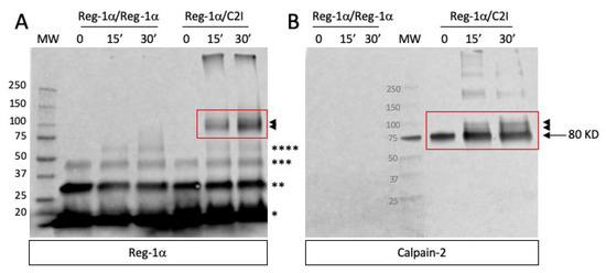 Considering that the possible cleavage of Reg-1α by calpain-2 implies that the two proteins directly interact which each other, we performed chemical crosslinking experiments using the purified inactive form of calpain-2 (mutant C105S referred as C2I) (see Section 4, Figure S1), and carbodiimide associated with N-hydroxysuccinimide (EDC-NHS) as bifunctional reagent. The advantage of such a mutant where the active cysteine has been changed to a serine is the ability to solely test the interaction between the two proteins. Figure 2 shows the result obtained after SDS-PAGE and western blot using both Reg-1α (Figure 2A) and calpain-2 antibodies (Figure 2B). As observed, the immunodetection with both antibodies of crosslinking products above 100 kDa (compatible with the sum of the molecular weight of the two proteins, red frame/arrowheads) demonstrated that calpain-2 interacts with Reg-1α compared to Reg-1α alone (Reg-1α-Reg-1α).
