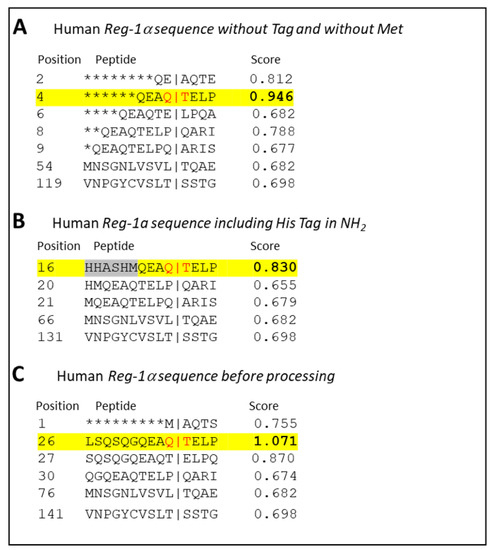 Prediction of the calpain-2 cleavage site of Reg-1α using GPS-CCD (calpain cleavage detector). (A,B) Result obtained using the GPS-CCD software [32] with the sequence of the recombinant human Reg-1α without (A) or with (B) the NH2-terminal His-tag and initial Met (natural protein/recombinant protein expressed in bacteria) and (C) with the human Reg-1α sequence, including the signal peptide (before processing). The position of the calpain-2 cleavage site predicted with the higher score is highlighted in yellow and the exact position noted in red. Note that the results of the score were obtained with the higher threshold.