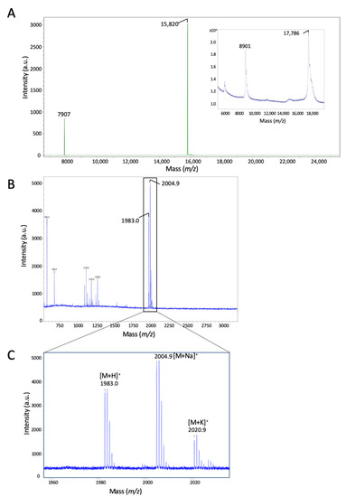 Molecular masses of the proteins/peptides were determined by MALDI-TOF (matrix-assisted laser desorption/ionization time-of-flight) mass spectroscopy on a Rapiflex (Bruker Daltonics, Bremen, Germany) mass spectrometer in positive linear mode and reflectron mode. Mass spectra were acquired in the mass ranges of m/z 500–3000 and 5000–25,000 for the reflectron and linear modes, respectively. Intensity and number of laser shots were adjusted to obtain an optimal signal-to-noise ratio; most data resulted from 5000 shots at a laser frequency of 5000 (linear)–10,000 (reflectron) Hz. External calibration was performed with Bruker peptide and protein standard kits. The samples were mixed 1:1 (v/v) with a solution of sinapinic acid (SA) at 10 mg/mL or a saturated solution of alpha-cyano-4-hydroxycinnamic acid (HCCA) for linear and reflectron modes, respectively. Peptide sequences were identified by manual analysis of fragment ions and subsequent comparison of predicted (ProtParam tool—Expasy for linear mode and sum of the monoisotopic mass of the amino-acids for the reflectron mode) and experimentally-obtained fragment patterns.