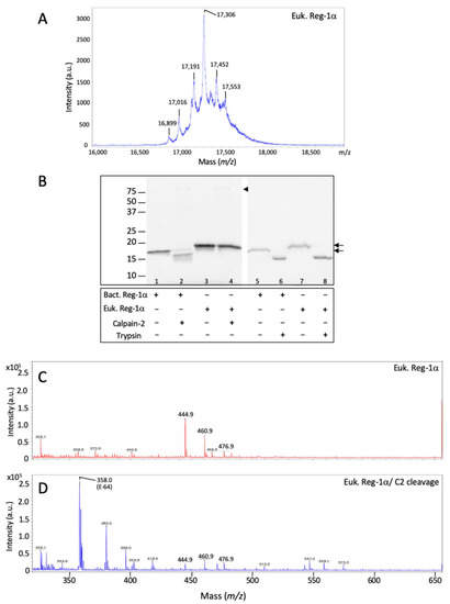 O-glycosylation of Reg-1α protects it from the calpain-2-mediated cleavage in vitro. (A) MALDI spectra of the eukaryotic Reg-1α (Euk. Reg-1α) obtained in the linear mode (m/z 16,000–19,000); (B) Both recombinant isoforms obtained from eukaryotic (Euk. Reg-1α) and bacterial (Bact. Reg-1α) sources were tested for calpain-2 (lanes 1–4) or trypsin cleavage (lanes 5–8) (ratio 1:10 and 1:100), respectively; samples were analyzed on 13.5% acrylamide gel and visualized using the Stain-Free Imaging Technology (see Section 4). Note that the protein from eukaryotic source displays a slightly higher molecular weight (see arrows) compared to the protein from bacteria due to the presence of glycosylation; arrowhead indicates the presence of calpain-2 (lanes 2,4). (C,D), MALDI reflectron mode spectra (m/z 300–650) of the glycosylated form of Reg-1α (Euk. Reg-1α) before (C) and after calpain-2 cleavage (Euk. Reg-1α /C2) (D). The position of the calpain inhibitor (E-64) used to stop the reaction is indicated.