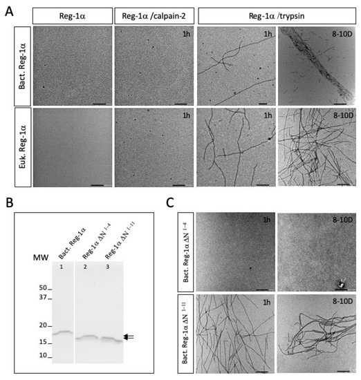 We used transmission electron microscopy experiments (TEM) to test the fibril formation with both recombinant Reg-1α proteins (bacterial and eukaryotic) in conjunction with the effect of calpain-2 treatment, compared to trypsin. As shown in Figure 6A, using both isoforms of Reg-1α, we did not observe any fibril formation 1 h after the calpain-2 treatment (middle panels, left), compared to the same experiment performed using trypsin (middle panel, right). As expected from previous studies with trypsin [12,13], the fibrils were of various lengths, from tens of nanometers to several micrometers. They were clearly visible after 1 h, and appeared organized in large bundles of 100–200 nm width after long incubation time (Figure 6A, right panel, 8–10 days) with Reg-1α of bacterial (top panel) compared to eukaryotic origin (bottom panel), indicating a possible influence of glycosylation on supramolecular organization of the fibrils. On the other side, even after a long period of calpain-2 incubation and regardless of the origin of Reg-1α, we did not observe fibril formation (data not shown).