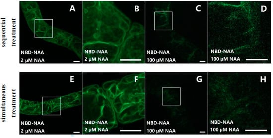 NBD-NAA and NAA compete for the same binding sites. Cells were incubated with NBD-NAA and different concentrations of NAA, either sequentially (A–D) or simultaneously (E–H). In both treatments, we administered the fluorescent analog for 20 min. In case of the pretreatment with non-fluorescent NAA, the treatment lasted for 20 min as well. Exemplarily, the results for 2 μM NAA (A,B,E,F), and for 100 μM NAA (C,D,G,H) are shown. To give the details of subcellular localization, the region marked by a white square in (A,C,E,G) is zoomed in on (B,D,F,H). Scale bar represents 10 μm.