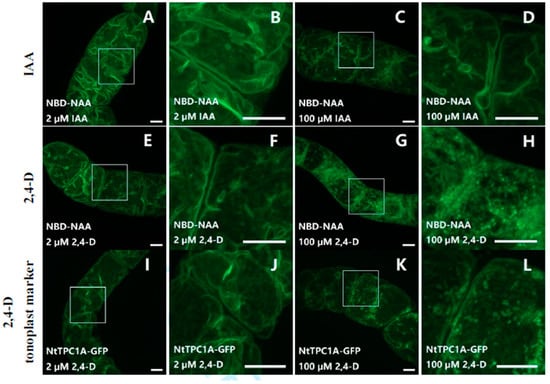 To further test whether other auxins (IAA or 2,4-D) would also compete with NBD-NAA, non-transformed BY-2 cells were co-incubated with NBD-NAA (2 μM) and either IAA (Figure 5A–D) or 2,4-D (Figure 5E–H) for 20 min, again in several concentrations. Exemplarily, the lowest (2 μM, Figure 5A,B for IAA, Figure 5E,F for 2,4-D) and the highest (100 μM, Figure 5C,D for IAA, Figure 5G,H for 2,4-D) concentrations are shown. In contrast to NAA (see Figure 4), none of these auxins (IAA or 2,4-D) were able to quench the fluorescent signal from NBD-NAA, even if given in a 50-fold excess (100 μM) over NBD-NAA (2 μM). (Figure 5A–H). However, 2,4-D, administered in this excessive concentration, altered the distribution pattern of NBD-NAA from the usual tonoplast-like pattern to a vesicular pattern (Figure 5H). To find out whether this altered pattern for the distribution of NBD-NAA was possibly caused by the disintegration of the vacuole into vesicles, the tonoplast-marker strain NtTPC1-GFP was treated with different concentrations of 2,4-D. The results obtained for the lowest (2 μM) and the highest (100 μM) concentration of 2,4-D are exemplarily shown in Figure 5I–L. While the tonoplast-maintained integrity under treatment with 2 μM 2,4-D (Figure 5I,J), it appeared to disintegrate into vesicular structures for the highest (100 μM) concentration of 2,4-D (Figure 5K,L). These results imply that neither IAA, nor 2,4-D can compete with NBD-NAA for the same binding sites. The changed localization of NBD-NAA seen under 100 μM of 2,4-D is correlated with a loss of tonoplast structure produced by these excessive concentrations of 2,4-D.