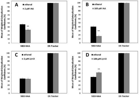 Mean values of weighted co-localization coefficients of NBD-NAA or ER-Tracker in non-transformed BY-2 cells. Cells were treated with either 2 μM NBD-NAA or the equivalent concentration of ethanol as solvent control before adding 1 μM ER tracker and incubating for 1 min. This experiment was conducted after pre-incubation for 20 min with either unlabeled IAA (A,B) or unlabeled 2,4-D (C,D) administered either in a concentration of 2 μM (A,C) or 100 μM (B,D), respectively. Data represent mean values and SE from 50 individual cells. Asterisks represent statistically significant differences (Student’s Independent two-sample t-test) with p < 0.01 (**), respectively.