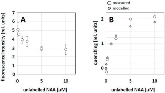 As NBD-NAA and NAA obviously competed for the same binding sites (see Figure 4), a dose–response curve for this competition was constructed by applying a constant concentration of NBD-NAA (2 μM) in combination with progressively increasing concentrations of NAA. Then, we measured the fluorescent intensity of the remaining NBD-NAA signal by quantitative image analysis to estimate the degree of competition. With increasing concentrations of unlabeled NAA, the relative fluorescence intensity (estimated as the corrected single cell fluorescence, CSCF) decreased progressively (Figure 7A). The resulting quenching effect (Figure 7B) was then fitted using a Michaelis–Menten model (i.e., assuming steady-state equilibria), reaching optimal congruence with the measured data with an estimated affinity constant of 1.15 μM NAA, which is consistent with the physiological data on NAA effects on tobacco BY-2 cells [].