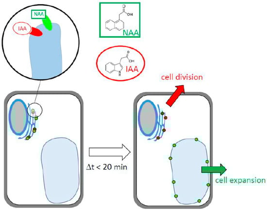 Although NAA often serves as a stable chemical analog for the natural auxin IAA, it differs not only with respect to transport, but also with respect to biological activity. For instance, while the uncharged form of IAA can permeate from the acidic apoplast through the plasma membrane into the cytoplasm, where it loses its proton and remains trapped [], the more hydrophilic NAA requires the AUX1 importer to enter the cell []. The differences in transport behavior also reflect the differences in the physiological effect. Cell elongation is under the control of a receptor system with a high affinity for NAA, while cell division requires higher concentrations of NAA []. Both auxin effects seem to differ in their signaling as well, since cell division requires the activation of a trimeric G-protein []. In fact, in the tobacco cell line VBI-0, where cell division and cell expansion separate more distinctly in time than in the BY-2 system, we showed that cell proliferation was more sensitive to activation by 2,4-D, while cell expansion was more sensitive to activation by NAA []. Furthermore, the response to 2,4-D could be blocked by the G-protein inhibitor pertussis toxin and activated by the G-protein activator aluminum tetrafluoride, while the response to NAA was not affected. Thus, there is compelling evidence for two auxin receptors (or, more precisely, for two perceptive events) that differ in their affinities for different ligands, deploy different signaling, and activate different cellular responses.