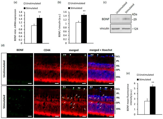 High-contrast stimulation promoted BDNF expression in the adult mouse retina. (a) Quantification of relative mRNA and (b) protein expression of BDNF in the retina of high-contrast-stimulated and unstimulated mice, and (c) representative Western blot images. (d) Immunofluorescence of BDNF (green); CD44, a marker of MCs (red); and Hoechst nuclear staining (blue) in the retina from high-contrast-stimulated and unstimulated mice. The arrowheads show BDNF expression in the GCL and the white arrows show the colocalization of BDNF with MCs. The scale bar is 20 µm. GCL, ganglion cell layer; IPL, inner plexiform layer; INL, inner nuclear layer; OPL, outer plexiform layer; ONL, outer nuclear layer. (e) Quantification of BDNF immunofluorescence intensity in the retina of stimulated and unstimulated mice. The data are presented as the mean ± SEM of 5 mice per group in each experiment. Difference between the high-contrast-stimulated and unstimulated groups: ++ p < 0.01 (unpaired t-test).
