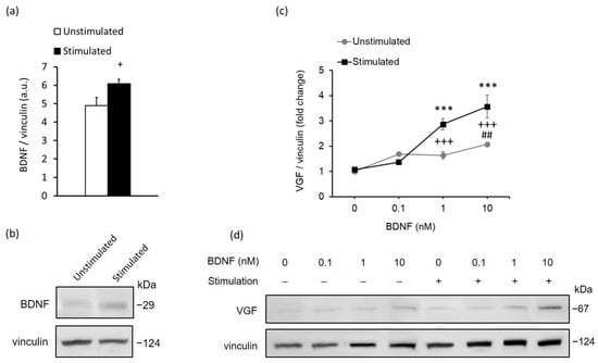 High-contrast stimulation of MCs potentiated their neurotrophic properties. (a) Densitometric Western blot analysis of BDNF expression in stimulated MCs with high contrast and unstimulated MCs; and (b) representative Western blot images from at least three independent experiments. Data are the means ± SEM. Difference between stimulated and unstimulated cells: + p < 0.05 (unpaired t-test). (c) Densitometric Western blot analysis of VGF expression in high-contrast-stimulated and unstimulated MCs, with additional exogenic BDNF administered at the indicated concentrations (0.1 nM, 1 nM, 10 nM), and (d) representative Western blot images of VGF from at least three independent experiments. The results are the means ± SEM. Data are presented as fold changes compared with VGF expression in the unstimulated MCs without BDNF treatment. Differences between the stimulated and unstimulated groups treated with the same concentration of BDNF: +++ p < 0.001. Differences between the high-contrast-stimulated group treated with BDNF and the high-contrast-stimulated group without BDNF treatment: *** p < 0.001. Differences between the unstimulated group treated with BDNF and the unstimulated group without BDNF treatment: ## p < 0.01 (two-way ANOVA followed by Tukey’s post-hoc test).