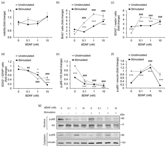 The combination of high-contrast stimulation and BDNF treatment augmented the neurodifferentiation potential and suppressed the pro-inflammatory phenotype of MCs. Quantification of (a) live MCs (fixable viability dye negative cells), (b) BrdU incorporation by MCs, (c) SOX2+/nestin+ MCs, and (d) SOX2+/GFAP+ MCs that were either stimulated by high contrast or unstimulated and cultured in the absence or presence of BDNF at the indicated concentrations (0.1 nM, 1 nM, 10 nM). Densitometric Western blot analysis of p-p65 expression in the (e) nuclear and (f) cytoplasmic extracts of high-contrast-stimulated and unstimulated MCs that were cultured in the absence or presence of BDNF at the indicated concentrations (0.1 nM, 1 nM, 10 nM). (g) Representative Western blot images of p-p65 expression in the nuclear and cytoplasmic extracts of high-contrast-stimulated and unstimulated MCs with or without BDNF treatment. Each experiment was repeated three times. The data are the means ± SEM. The results are presented as fold changes from the control group (unstimulated MCs without BDNF treatment). Differences between the stimulated and unstimulated groups treated with the same concentration of BDNF: + p < 0.05, ++ p < 0.01, +++ p < 0.001. Differences between the high-contrast-stimulated group treated with BDNF and the high-contrast-stimulated group without BDNF treatment: ** p < 0.01, *** p < 0.001. Differences between the unstimulated group treated with BDNF and the unstimulated group without BDNF treatment: ## p < 0.01, ### p < 0.001 (two-way ANOVA followed by Tukey’s post-hoc test).