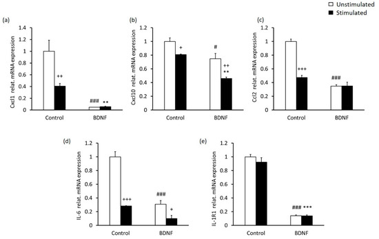 Alterations in the gene expression of chemokines and pro-inflammatory cytokines in MCs after stimulation with BDNF and high contrast. The mRNA levels of chemokines (a) Cxcl1 (b) Cxcl10 (c) Ccl2, (d) pro-inflammatory cytokine IL-6 and (e) IL-1 receptor type 1 in untreated MCs and MCs treated with 10 nM BDNF and/or high-contrast stimulation. The data are presented as the fold change compared with control (the group without high-contrast stimulation in the absence of BDNF). Differences between the high-contrast stimulated and unstimulated groups: + p < 0.05, +++ p < 0.001. Differences between the high-contrast-stimulated group treated with BDNF and the high-contrast-stimulated group without BDNF treatment: ** p < 0.01, *** p < 0.001. Differences between the unstimulated group treated with BDNF and the unstimulated group without BDNF treatment: # p < 0.05, ### p < 0.001 (two-way ANOVA followed by Tukey’s post-hoc test).