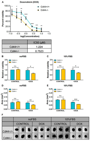 In order to study the relevance of CD44 in mediating chemoresistance, we previously isolated osteosarcoma cells from mice that developed endogenous osteosarcoma, due to a mutation of the tumor suppressor gene Nf2 [38]. To enable the analysis of CD44-dependent processes in genetically comparable tumor backgrounds, Cd44 was deleted in Nf2-deficient osteosarcoma cells, using the CRISPR/Cas9 approach [38]. Our results show that Cd44-positive cells were more resistant to doxorubicin treatment than the Cd44-negative cells (IC50 of 1.224 versus 0.7523 µM, respectively, p = 0.000793) (Figure 1A). We also measured doxorubicin sensitivity in three-dimensional cell culture, which was shown to better mimic the drug sensitivity/resistance behavior of cancer cells found in solid tumors in vivo, than the conventional two-dimensional monolayer conditions (reviewed by Weiswald et al. [1]). Osteosarcoma cells grown under nonadherent conditions formed one single spherical colony per well of a 96-well plate. Doxorubicin-treated Cd44-positive osteosarcoma cells formed significantly larger colonies than their Cd44-negative counterparts, independent of medium supplementation with serum. The size of Cd44-positive and Cd44–negative colonies was not significantly different in the absence of doxorubicin (Figure 1B–F).