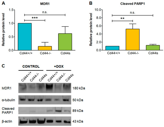 The shortest, standard isoform of CD44 (CD44s) is sufficient to confer resistance to doxorubicin (DOX). Osteosarcoma cells were seeded at 60% confluency in DMEM medium, supplemented with 7% FBS. The cells were incubated for 24 h in the presence of 1 µM DOX or pure solvent (control) and then subjected to immunoblot. The histograms in (A,B) show mean values of MDR1 or cleaved PAPR1 protein levels ± SD from three independent experiments. The values were normalized to loading control. Student’s t-test values: n.s.: p > 0.05, **: p ≤ 0.01, ***: p ≤ 0.001. Representative immunoblot is shown in (C).