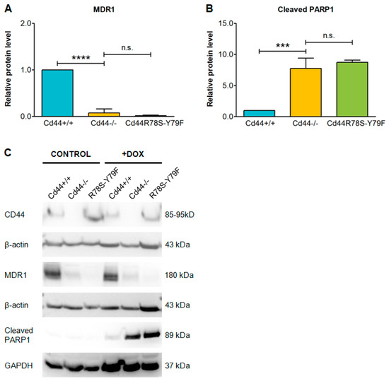 CD44 serves as a major receptor for hyaluronic acid (HA). Binding of CD44 to HA plays an important role in cell adhesion and signaling [43]. To test involvement of the CD44-HA interaction in chemoresistance, we generated a mutant of CD44 that is unable to bind HA [44]. Re-introduction of this HA-binding deficient mutant, CD44s-R78S-Y79F into Cd44−/− cells was not sufficient to reconstitute MDR1 protein levels in those cells (Figure 3A,C). Consistently, cells expressing CD44s-R78S-Y79F mutant released similar levels of cleaved PARP1 as the Cd44-deficient cells (Figure 3B,C), suggesting that an intact HA-binding site of CD44 is indispensable for conferring doxorubicin chemoresistance.