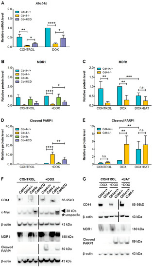 Consistently with the above observations, overexpression of CD44ICD in Cd44-negative osteosarcoma cells could partially re-establish the protein levels of MDR1 and significantly reduced the doxorubicin-induced levels of the apoptotic marker cleaved PARP1 (Figure 4B,D,F).