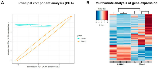 Altogether, our results suggest that CD44 contributes to doxorubicin chemoresistance in osteosarcoma cells by regulating MDR1 expression and function. To test if CD44 regulates additional processes that may be involved in chemoresistance regulation, RNA sequencing was performed on Cd44-positive and Cd44-negative primary osteosarcoma tissues isolated from Nf2-mutant mice described previously [38]. Three samples of each group were analyzed. Cd44+/+ and Cd44−/− primary osteosarcomas clearly segregated from one another based on their RNA expression profiles (Figure 5A,B). A total of 1592 genes were differentially expressed between Cd44-positive and Cd44-negative osteosarcomas. List of significant genes is included in Table S1.
