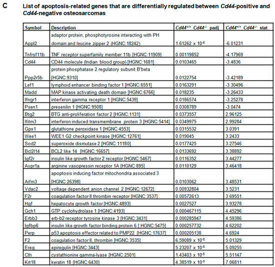 Gene expression analysis. (A) Principal component analysis (PCA) of RNA sequencing data. Data were plotted along the first and forth principal components. Each dot in PCA plot indicates a single sample. (B) Multivariate analysis of gene expression between Cd44-positive and Cd44-negative primary osteosarcomas. Unsupervised hierarchical clustering and heatmap showing Cd44+/+ and Cd44−/− primary osteosarcomas clearly segregated from one another, based on their RNA expression profiles. Three samples of each group were analyzed. Both downregulated (blue) and upregulated (red) RNAs were identified in Cd44−/− osteosarcomas. The analysis was performed using an MADE4 package of R software. (C) List of apoptosis-related genes that are differentially regulated between Cd44-positive and Cd44-negative osteosarcomas. The data are represented as Wald-statistic (stat). Genes with negative Wald-statistic values are down-regulated in Cd44−/− compared to Cd44+/+ primary osteosarcomas, and genes with positive values are upregulated. Benjamin Hochberg adjusted p-value (padj) is indicated. Gene description source: HGNC (www.genenames.org/, accessed on 31 May 2022).