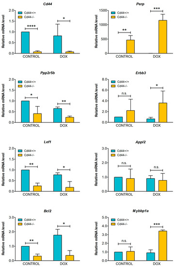 Testing mRNA levels of selected apoptosis-associated genes. Cd44-positive wild-type cells, Cd44-negative cells, and cells with reconstituted expression of Cd44s and Cd44ICD were seeded at 60% confluency in DMEM medium supplemented with 7% FBS. The cells were incubated for 24 h with pure solvent (controls) or 1.5 µM DOX. The histograms show mean values of mRNA levels ± SD from three independent experiments. Student’s t-test values: n.s.: p > 0.05, *: p ≤ 0.05, **: p ≤ 0.01, ***: p ≤ 0.001, ****: p ≤ 0.0001.