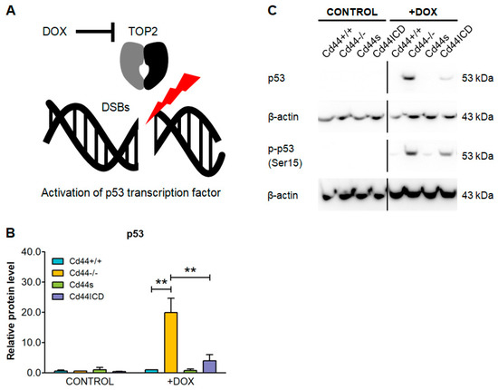 Testing the effect of doxorubicin (DOX) on p53 level in osteosarcoma cells. (A) DOX inhibits topoisomerase II (TOP2) leading to DNA damage in the form of double-strand breaks (DSBs). As a consequence, the DNA damage response and p53 pathways are activated, which leads to cell cycle arrest and cell death. (B,C) DOX increases levels of active p53 in Cd44-negative osteosarcoma cells. The cells were treated as in Figure 4. The histogram in (B) shows mean value of p53 protein level ±SD from three independent experiments. The values were normalized to loading control. Student’s t-test values: **: p ≤ 0.01. Representative immunoblots for detection of total and phosphorylated p53 are shown in (C). Please notice that phosphorylated p53 was detected by reprobing lower membrane part from the experiment in Figure 4F, therefore the β-actin is the same.