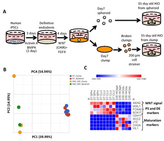Generation of HIOs from human pluripotent stem cells requires the successful execution of all steps during the differentiation process. One of the key roadblocks in the generation of HIOs is the generation of mid/hindgut spheroids from definitive endoderm. To bypass this roadblock, multiple groups have generated HIOs by passaging monolayers of mid-hindgut patterned definitive endoderm (DE) as clumps, and then plating these clumps in extracellular matrix. Over time, the cells within clumps will self-organize and develop into HIOs [21,22,23]. Although these methods have been reported to generate HIOs which resemble developing human intestine, a direct comparison of spheroid-generated and clump-generated HIOs has not been carried out previously. We therefore generated spheroids and clumps to generate HIOs (Figure 1A). We then performed RNA-seq analysis of 7-day-old spheroids and clumps, as well as 35-day-old HIOs grown from the former. Principal component analysis revealed that 7-day-old spheroids and clumps clustered together, while 35-day-old HIOs (from spheroids and from clumps) clustered together along principal component 1 (PC1) axis, which accounted for 40% of the cumulative variation among samples (Figure 1B). Closer examination of the RNA-seq data revealed that genes associated with WNT signaling (AXIN2), primitive streak (MIXL1) and definitive endoderm (FOXA2 and SOX17) were all highly enriched in 7-day-old spheroids/clumps compared to 35-day-old HIOs from spheroids/clumps (Figure 1C). In contrast, genes associated with maturation (CDH17) and cytodifferentiation (MUC2, LYZ, CHGA and VIL1) were all highly enriched in 35-day-old HIOs from spheroids/clumps compared to 7-day-old spheroids/clumps. These data indicate that clumps and spheroids share a similar transcriptional profile. Furthermore, our data indicate that the source of mid/hindgut tissue (whether spheroids or clumps) does not perturb the growth, maturation or cytodifferentiation of HIOs.