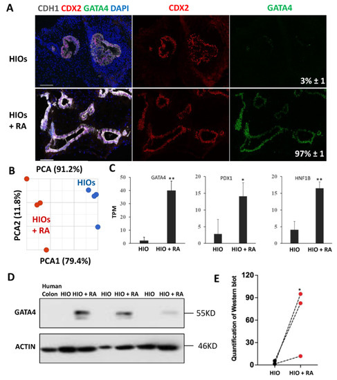 Retinoic acid patterns of HIOs in vitro. (A) Immunofluorescence staining of 35-day-old organoids from (HIOs and HIOs + RA) for CDH1 (white), CDX2 (red), GATA4 (green) and counterstained with DAPI. Numbers in GATA4 panel represent the percentage of GATA4-positive epithelial cells ± the SEM. N = 7 organoids per treatment group. (B) Principal of 35-day-old HIOs and HIOs + RA. N = 4 per treatment group. (C) Graph of TPM values from RNA-seq data of 35-day-old HIOs and HIOA. Values are displayed as the mean ± SD. n = 4 per treatment group. (D) Western blot for GATA4 expression from human colon (negative control), HIOs and HIOA from 3 different experiments. (E) Densitometric analysis of Western blot data from the panel (C). * denotes a p value of <0.05. ** denotes a p value of <0.01 based on t-test.