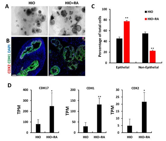 The examination of organoids through light microscopy revealed that after 35 days, HIOs + RA continued to have improved epithelial growth and less mesenchyme than HIOs grown in control media (Figure 4A). Immunofluorescence staining and image quantification of organoids stained for the pan-intestinal epithelial marker CDX2, the epithelial marker CDH1 (also known as E-cadherin) and DAPI revealed a significant increase in the percentage of epithelial cells within HIOs treated with RA compared to control HIOs (Figure 4B,C). Gene ontology analysis of the “Cellular component” category revealed a significant increase in genes associated with cell–cell junction, apical part of cell, microvillus (Table S1), consistent with an increase in epithelium in RA-treated HIOs. To further confirm these observations, we examined the RNA-seq data from 35-day-old HIOs and HIOs + RA. Cadherin-17 (CDH17), CDH1 and Caudal Type Homeobox 2 (CDX2) mRNA levels were significantly increased in HIOs treated with RA compared to control HIOs. These results indicate that the epithelial composition of HIOs is improved by RA treatment.