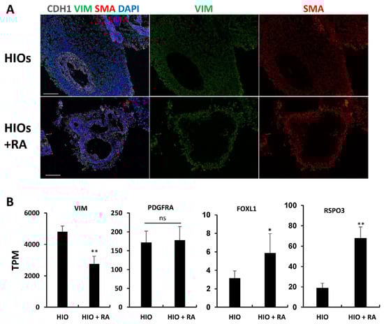 HIOs and HIOs + RA are grown in media-containing EGF, but lack other factors required for epithelial growth such as NOGGIN and R-SPONDIN. We postulated that despite having less mesenchyme, RA-treated organoids would have an increased proportion of epithelium-supportive mesenchyme. To test this, we performed immunofluorescence staining for vimentin (VIM) and smooth muscle actin (SMA). Co-staining of VIM and SMA in mesenchymal cells has been used to identify intestinal subepithelial myofibroblasts (ISEMFs) which can support the growth of human intestinal epithelium [25,26,27]. We found that HIOs only had rare VIM+/SMA+ cells. In contrast, HIOs + RA had VIM+/SMA+ cells which surrounded the epithelium (Figure 5A). To further confirm differences in the mesenchyme of HIOs and HIOs + RA, we examined our RNA-seq data (Figure 5B). Examination of the mesenchymal marker Vimentin (VIM) revealed a significant increase in mRNA expression in HIOs compared to HIOs + RA. This is consistent with our immunostaining results and quantification of epithelial and non-epithelial cells. Interestingly, despite an overall increase in the amount of non-epithelial cells in HIOs compared HIOs + RA, the expression of PDGFRA, a marker of mesenchymal cells which directly interact with the epithelium [28,29], was not different between the two groups. Furthermore, the mRNA expression levels of makers of intestinal epithelial stem cell niche supportive mesenchyme, FOXL1 and RSPO3, were higher in HIOs + RA than in the control HIOs. These data indicate that although RA restricts the growth of mesenchyme, RA seems to select mesenchymal cells which can support the growth and self-renewal of stem cells within the organoid epithelium.