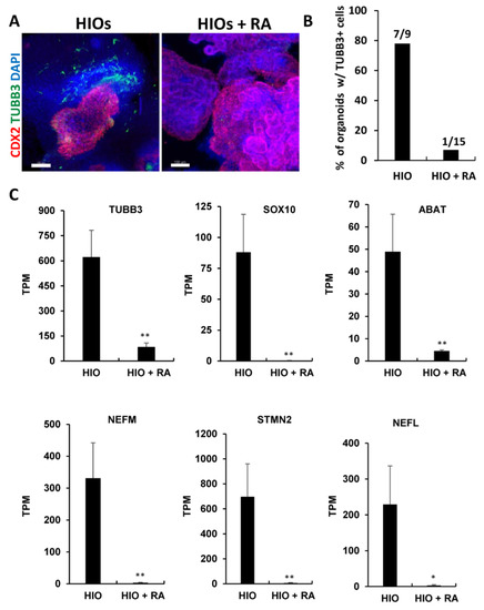 Retinoic acid inhibits the co-development of neurons in HIOs. (A) Whole-mount immunofluorescence staining of 35-day-old organoids from (HIOs and HIOs + RA) for CDX2(red), TUBB3 (green) and counterstained with DAPI. (B) The quantification of the percentage of organoids with TUBB3-positive cells. The number on the graph represents the number of organoids with TUBB4-positive cells divided by the total number of organoids analyzed. (C) Graphs of TPM values of neuronal genes from RNA-seq data of 35-day-old HIOs and HIOs + RA. Values are displayed as the mean ± SD. n = 4 per treatment group. * denotes a p value < 0.05. ** denotes a p value < 0.01 based on t-test.