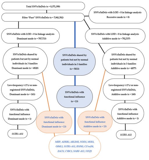 The number of SNVs/InDels in the variant call format (VCF) file was 8,371,398, and 7,941,582 SNVs/InDels were chosen by the process of Filter “Pass” (Figure 3). In these 7,941,582 SNVs/InDels, loci with zero and negative values of LOD scores in linkage analysis were used first to exclude the non-relevant SNVs/InDels. The number of SNVs/InDels located at loci with positive values of LOD scores in the linkage analysis was 787,733 in the dominant mode, 792,537 in the additive mode, and zero in the recessive mode of inheritance. Candidate SNVs/InDels that were shared by all six patients and further not shared by all three normal individuals were 4920 of 787,733 in the dominant mode and 4877 of 792,537 in the additive mode (Figure 3).