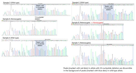 To confirm the results of whole genome sequencing, the 13-nuecleotide deletion in SSTR5-AS1 was tested by targeted PCR (Figure 1B). The heterozygosity for the 13-nucleotide deletion in five patients was consistent between whole genome sequencing and targeted PCR (Figure 1B), while one patient (Sample 8, Mother in Family 3) heterozygous for the 13-nucleotide deletion in whole genome sequencing was disclosed as homozygous for the deletion by direct sequencing of the PCR product (Figure 4, Table 2). The other patient (Sample 6, Mother in Family 2) homozygous for the 13-nucleotide deletion was confirmed as such by targeted PCR and direct sequencing (Figure 4).
