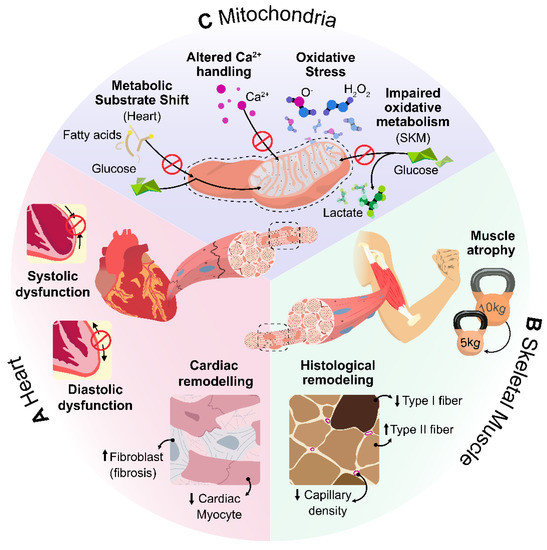 In the multifactorial origin of HF, pathophysiological changes in several organ systems contribute to the development of signs and symptoms. Exercise tolerance in HF is influenced by changes in cardiovascular performance (Figure 1A), skeletal muscle (Figure 1B), and mitochondrial metabolism (Figure 1C) [2,59,73].