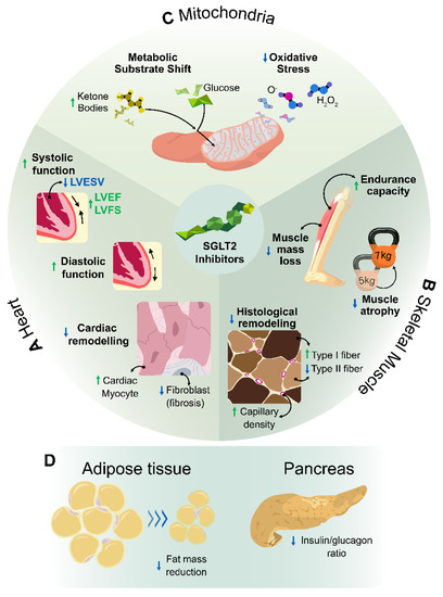 Figure 3. Potential effects of SGLT2 inhibitors within different organ systems that influence exercise capacity in HF beneficially. This figure depicts potential benefits of sodium-related glucose transporter 2 (SGLT2) inhibitor treatment on the heart, skeletal muscle, and metabolism, potentially improving exercise tolerance in heart failure. These benefits include: (A) improvement of cardiovascular performance, including improvement of systolic function, improvement of diastolic function, and attenuation of cardiac remodeling; (B) improvement of skeletal muscle function, including amelioration of skeletal muscle remodeling, an increase in muscle strength, preservation of skeletal muscle mass, and improvement of muscle endurance capacity; (C) beneficial metabolic and mitochondrial effects, including improvement of mitochondrial function, a metabolic substrate shift leading to a beneficial change in cardiac energy production, and a decrease in oxidative stress; (D) a reduction in bodyweight and a decrease in the insulin–glucagon ratio.
