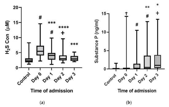 Plasma H2S and SP concentrations in bacteraemic subjects are shown in Figure 1a,b. The median concentrations of H2S in subjects were higher than controls (n = 50) on days 0, 1, and 2 (p < 0.0001, p < 0.0001, p = 0.0075, respectively) but not on day 3 (p = 0.09). Day 0 concentrations of H2S (n = 44) were higher than days 1 (n = 40, p = 0.0011), 2 (n = 27, p < 0.0001), and 3 (n = 10, p = 0.003). Concentrations on day 1 were not significantly higher than on days 2 and 3 (p = 0.051 and 0.09), respectively.