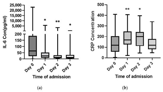 The median concentrations of SP on day 0 (n = 44, IQR 0.0–0.42) did not differ from day 1 (n = 41, p = 0.55) but were higher on days 2 (n = 25, p < 0.0001) and 3 (n = 9, p = 0.0002). Interleukin-6 concentrations were highest on day 0 (n = 38) compared to days 1 (n = 40, p = 0.0401) and 2 (n = 29, p = 0.0036). C-reactive protein (CRP) was higher on days 1 (n = 40, p = 0.007) and 2 (n = 40, p = 0.0149) compared to day 0 (n = 46) (Figure 2a,b).